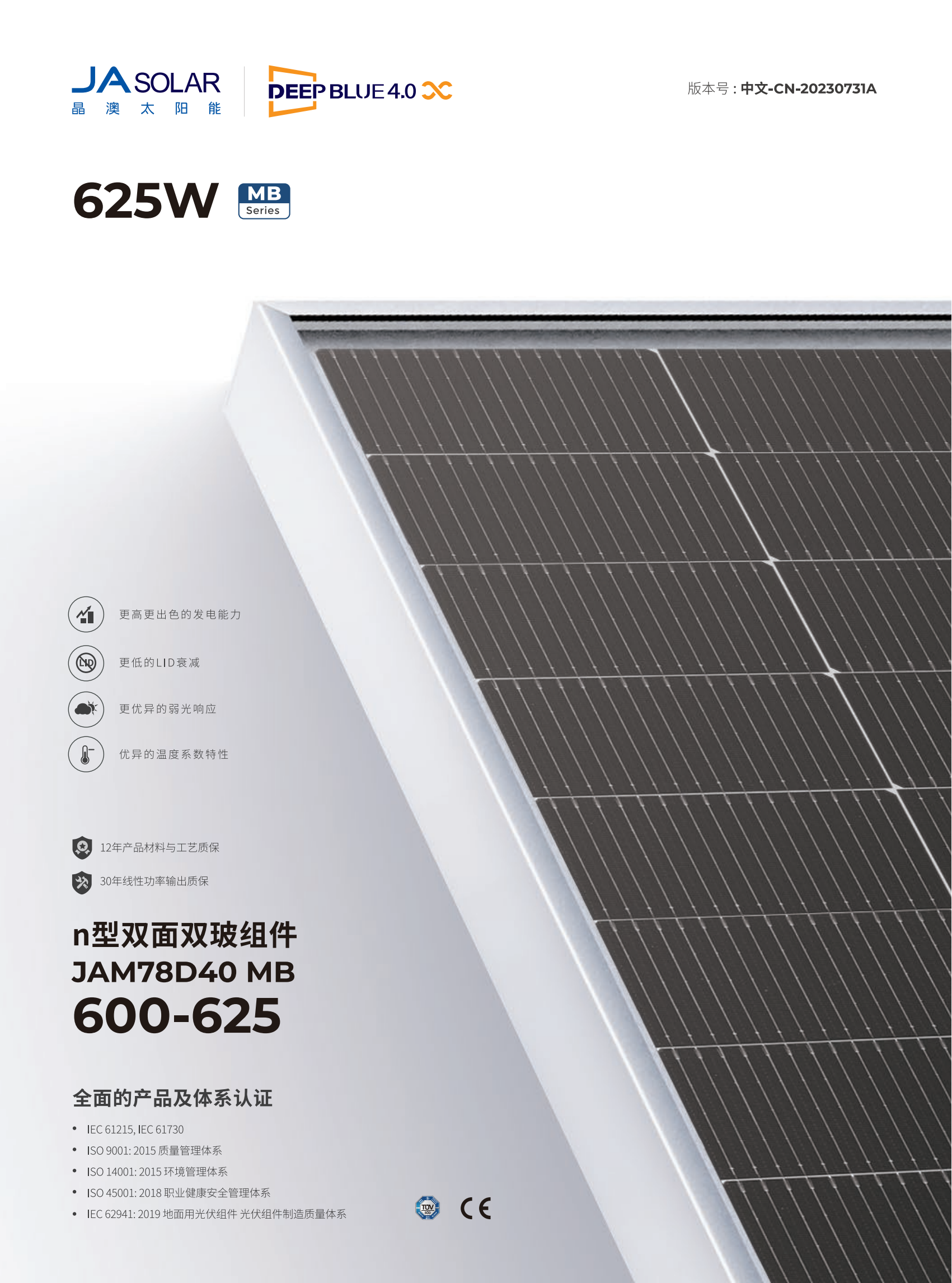 晶澳光伏组件N型双玻600W-625W(JAM78D40 600-625/MB)